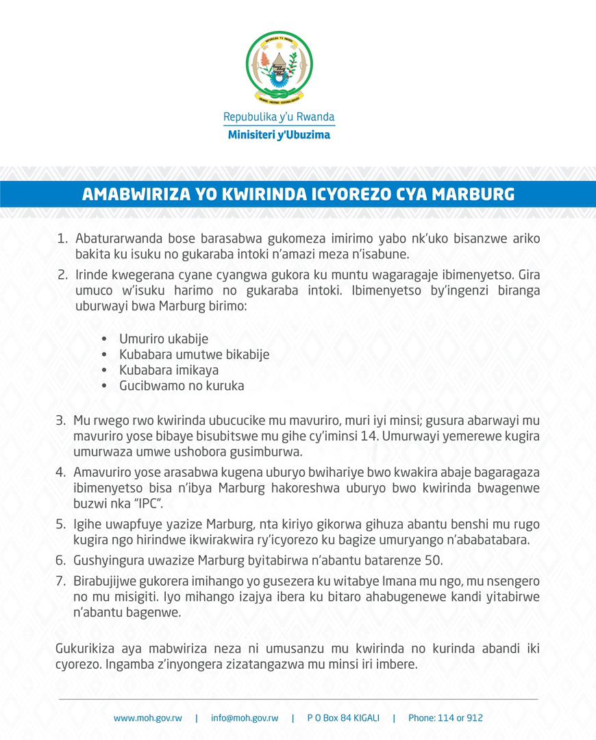 Minisiteri y’ubuzima mu Rwanda imaze gutanaza amabwiriza yo kwirinda icyorezo cya Marburg harimo no guhagarika ibikorwa byo gusura abarwayi mu mavuriro yose nibura mu gihe cy’iminsi 14.