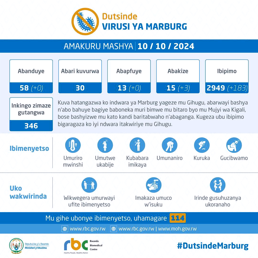 Mu butumwa Minisante itanga buri munsi, bugaragaza uko icyorezo cya Marburg gihagaze mu gihugu, ubuheruka bwo ku mu goroba wo ku wa Kane tariki 10 Ukwakira 2024 harimo ko ‘Kuva hatangazwa ko indwara ya Marburg yageze mu gihugu, abarwayi bashya n’abo bahuye bagiye baboneka muri bimwe mu bitaro byo mu mujyi wa Kigali, bose bashyizwe mu kato kandi baritabwaho n’abaganga. Kugeza ubu, ibipimo bigaragaza ko iyi ndwara itakwiriye mu gihugu.’